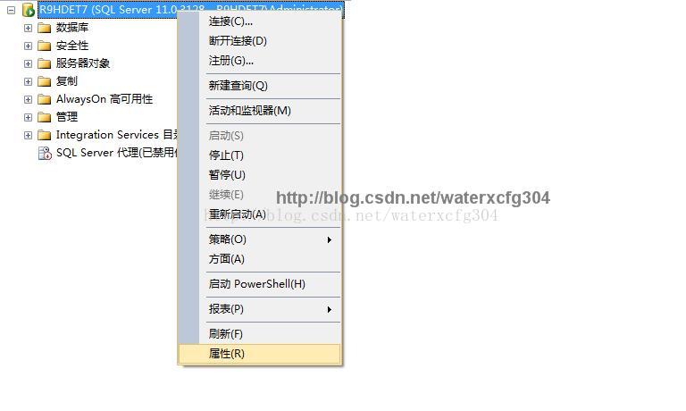 1.以“Windows 身份验证”方式登录,进入服务器,点击右键,选择属性: