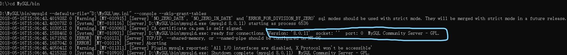 mysqld --defaults-file="D:\MySQL\my.ini" --console --skip-grant-tables