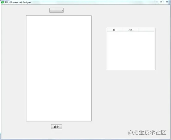 2.创建后,可以方便快捷的用Qt Designer画出对应框体,如通过Combo Box添加下拉选择的控件;通过Push Button添加按钮;通过List Widget添加列表框;通过Table Widget添加数据表格框,table中设置列数(右键-Edit Items-Colums),调整框体位置和文字大小,背景颜色以及windowTitle来优化界面显示,使用快捷键Ctrl+R预览当前编写的GUI显示如下: