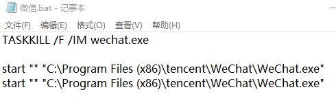 #启动前,杀掉wechat的残留进程 TASKKILL /F /IM wechat.exe #使用命令行启动微信进程,每一行命令为启动一个 start "" "C:\Program Files (x86)\tencent\WeChat\WeChat.exe" #启动了两个微信进程 start "" "C:\Program Files (x86)\tencent\WeChat\WeChat.exe"