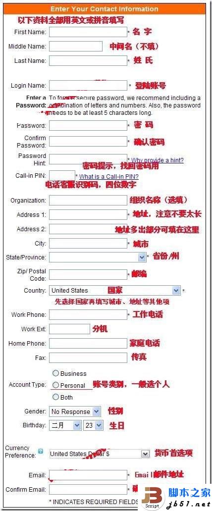 2、进入帐号资料填写页面,按照下图的字段填写.