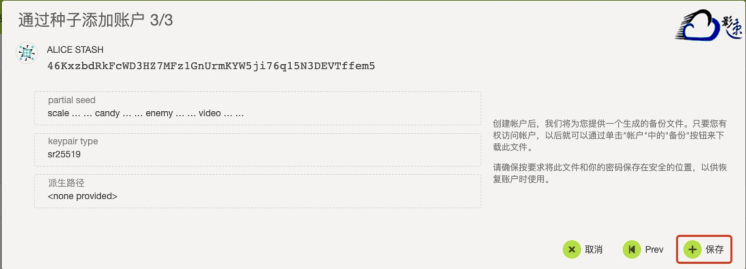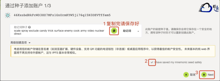 3. 复制并记下助记词种子,在弹窗中勾选“I have saved my mnemonic seed safely”,再点击 Next。注意:这里的助记词种子请务必记录保存好!
