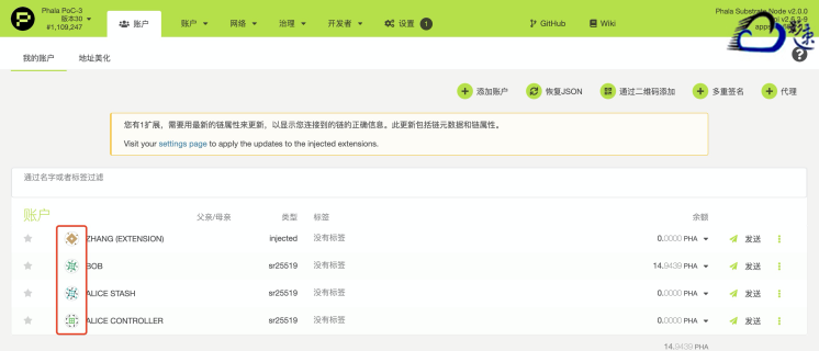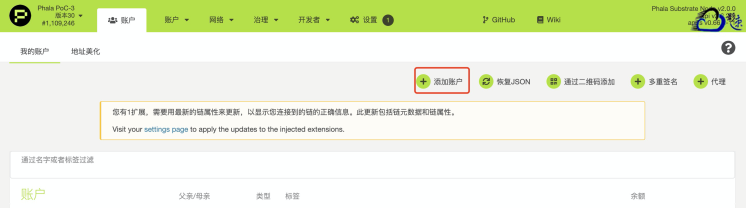 1. 进入 Phala 测试网账号管理页面 https://poc4a.phala.network/polkadotjs/#/accounts 或 https://poc4.phala.network/polkadotjs/#/accounts 或备用链接 https://poc4a-2.phala.network/polkadotjs/#/accounts