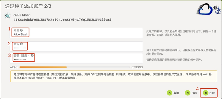 4. 填写:名称、密码、密码二次确认(如果您要参与守门人或矿工,建议在名称上加上 stash/controller 这样成对的后缀),之后点击 Next