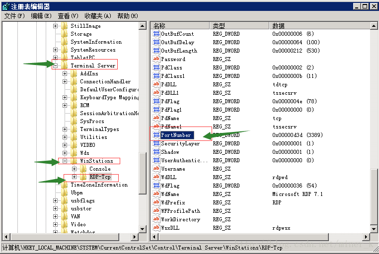 [HKEY_LOCAL_MACHINE\SYSTEM\CurrentControlSet\Control\Terminal Server\Wds\rdpwd\Tds\tcp]其下的”PortNumber”键值所对应的就是端口号,此处设置为2121